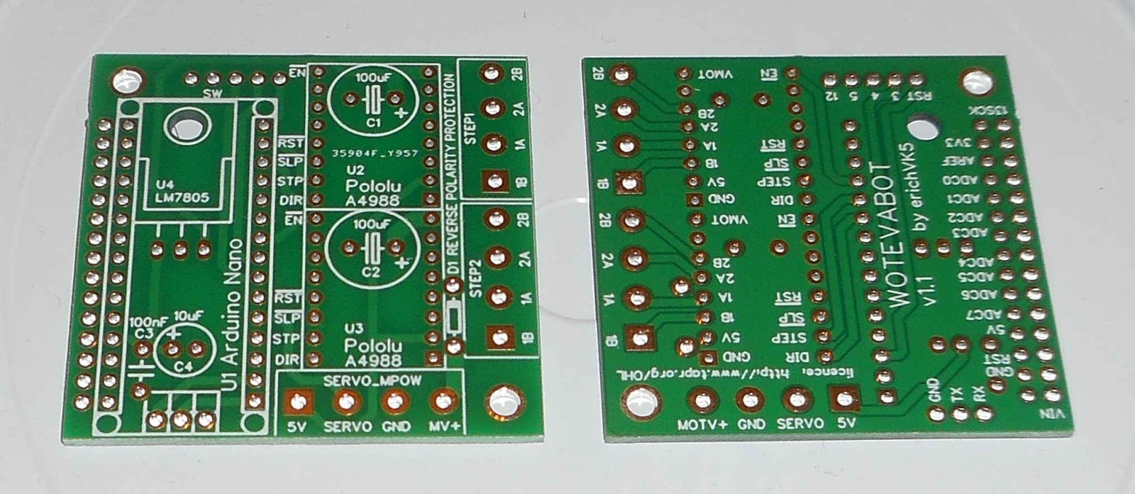Here's a simple board intended for use in an eggbot designed in gEDA PCB, using an Arduino nano footprint, TO-220 footprint, electrolytic capacitor footprints, and a DIP16 Pololu footprint imported from Kicad modules.