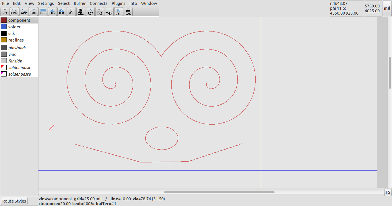 Being able to export paths to PCB layout software is useful for a number of reasons, such as enabling custom or artisanal board outlines and tracks to be implemented, such as the following flying spaghetti monster (FSM) designed with pcb-rnd and FidoCadJ: