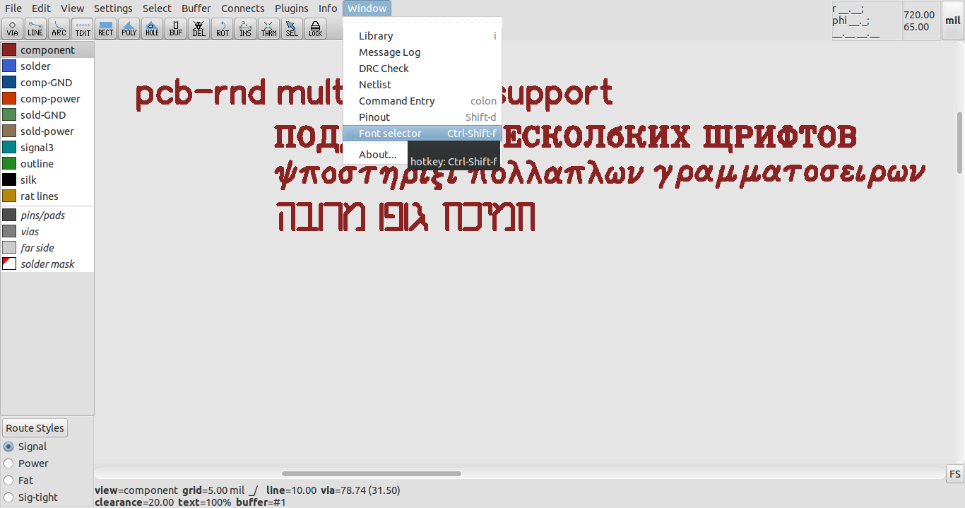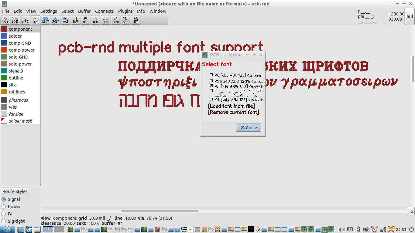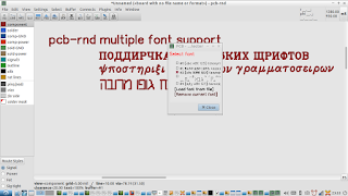 The support for these fonts has been made possible by the multiple font support recently implemented in pcb-rnd, in addition to the newly implemented support for polygons within font glyphs in the new pcb-rnd lihata (.lht) file format used for both pcb layouts and font files.