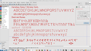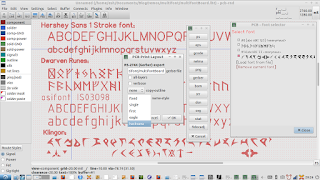 Here's a screen shot of the exported gerber being viewed in the gerber viewer gerbv, showing dwarvish runes, Klingon, osifont, and the Hershey Sans One Stroke font.