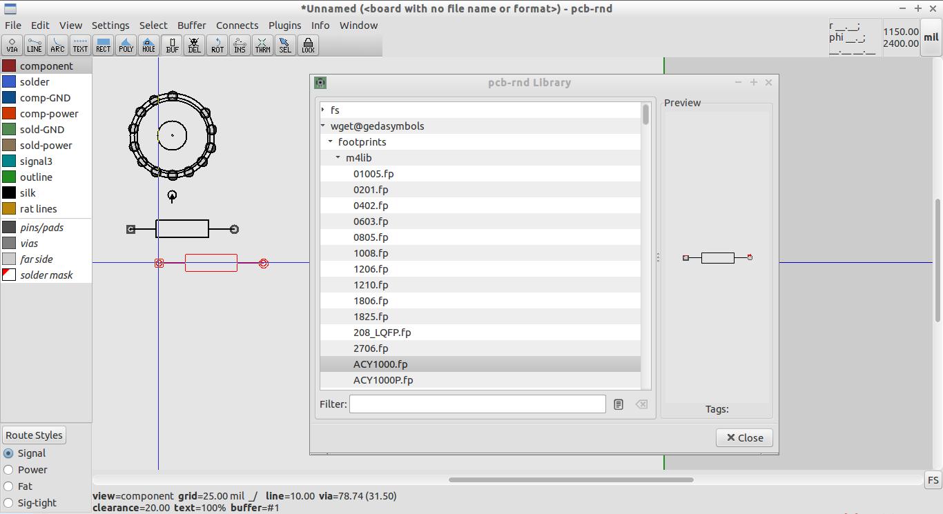 Unlike mainline PCB, the pcb-rnd user has the ability to then browse the local filesystem libraries, specify and edit a parametric footprint, or retrieve a footprint from a web based repository if it has been specified in the preferences.