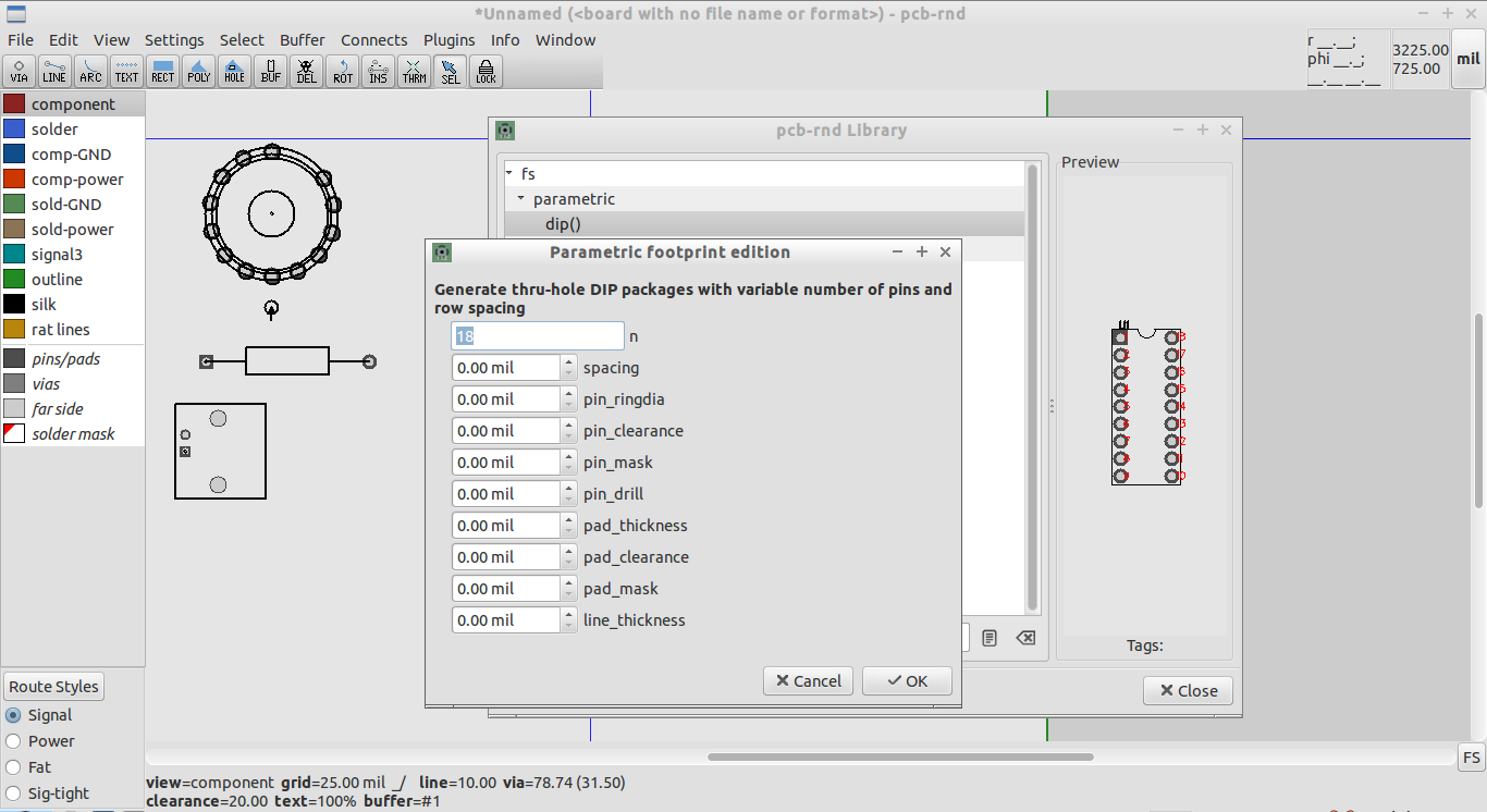 And here's a parametric DIP socket being specified on the fly in the parameter editing window: